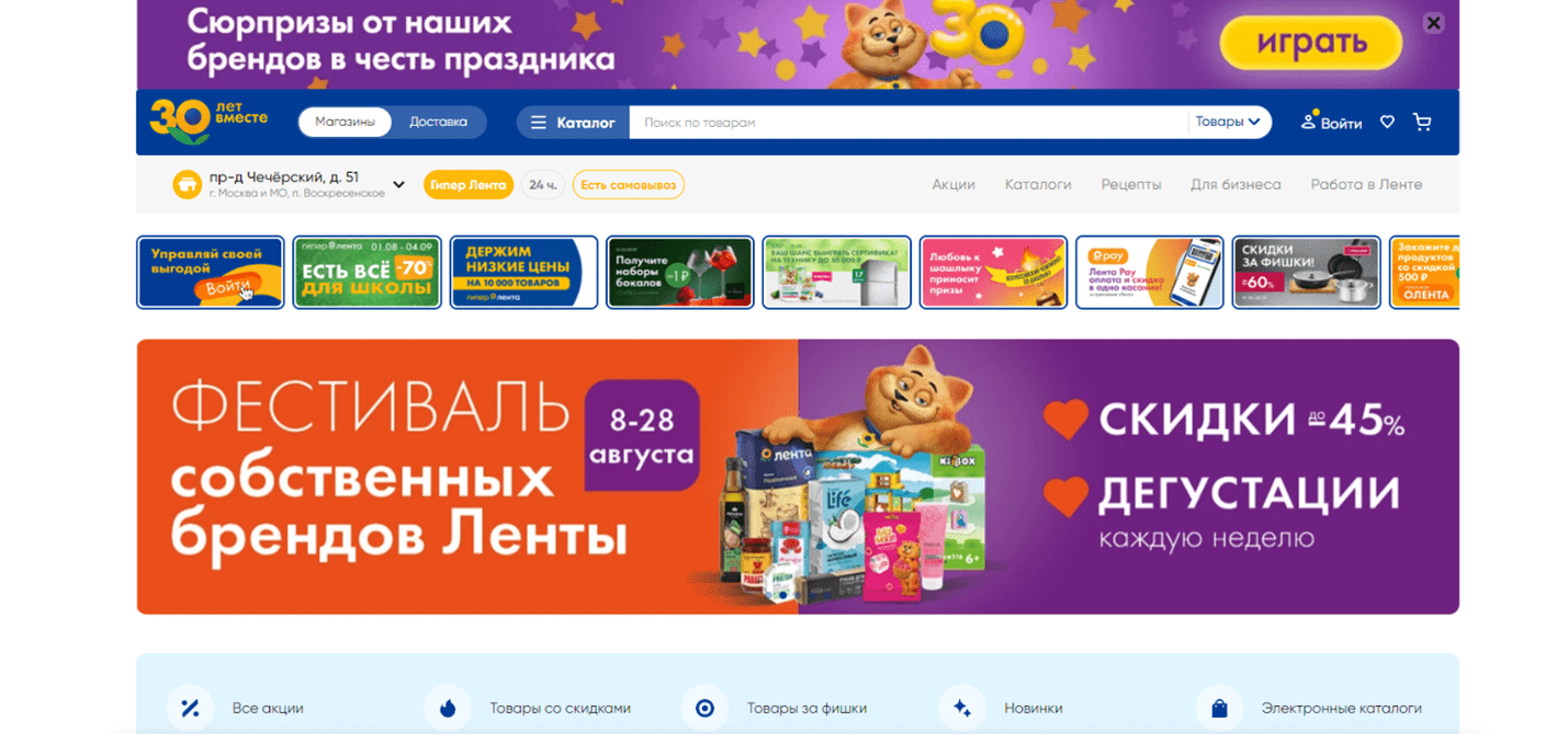 На первой странице каталога вы найдете товары со скидками, «ТОП популярных продуктов», раздел «Цены как вчера». Остальные позиции систематизированы по 120 категориям. При покупке акционных и товаров собственного бренда можно прилично сэкономить.